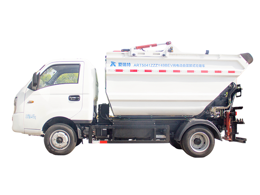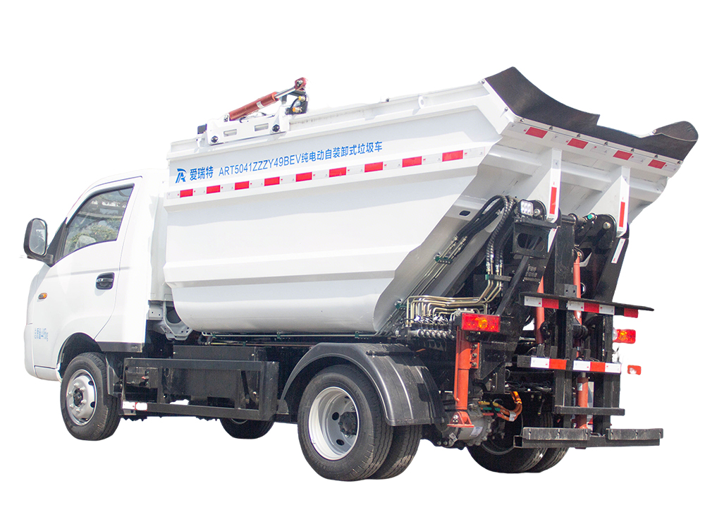 ART5041ZZZY49BEV純電動自裝卸式垃圾車采用后置翻桶機構(gòu)上料,高位傾翻垃圾箱卸料的生活垃圾收運車,能夠同時滿足兩個標(biāo)準(zhǔn)垃圾桶同時上料,?作業(yè)效率極高,?適合城市小區(qū)、主次干道和沿街標(biāo)準(zhǔn)垃圾桶的收運,同時可以與大型純電動壓縮式垃圾車進(jìn)行車車對接。