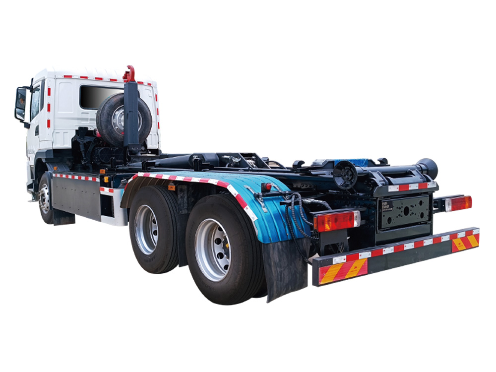 - 鉤臂系統:拉臂裝置安裝在底盤上,其主要功能有拉箱、卸箱和卸料等,關鍵部位采用高強度精鑄件,提高安全性和延長使用壽命。結構合理,外形美觀,大臂降落帶感應裝置。