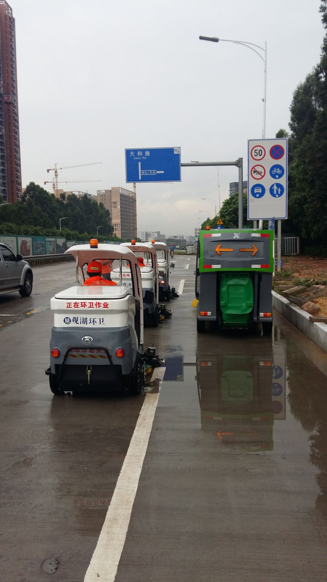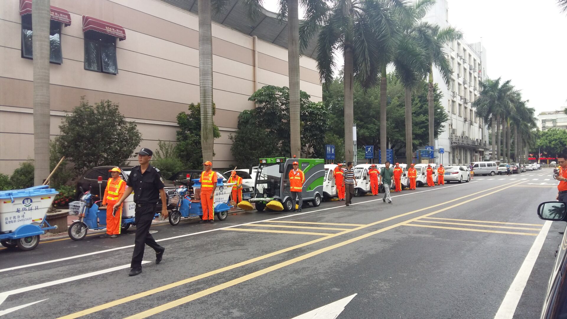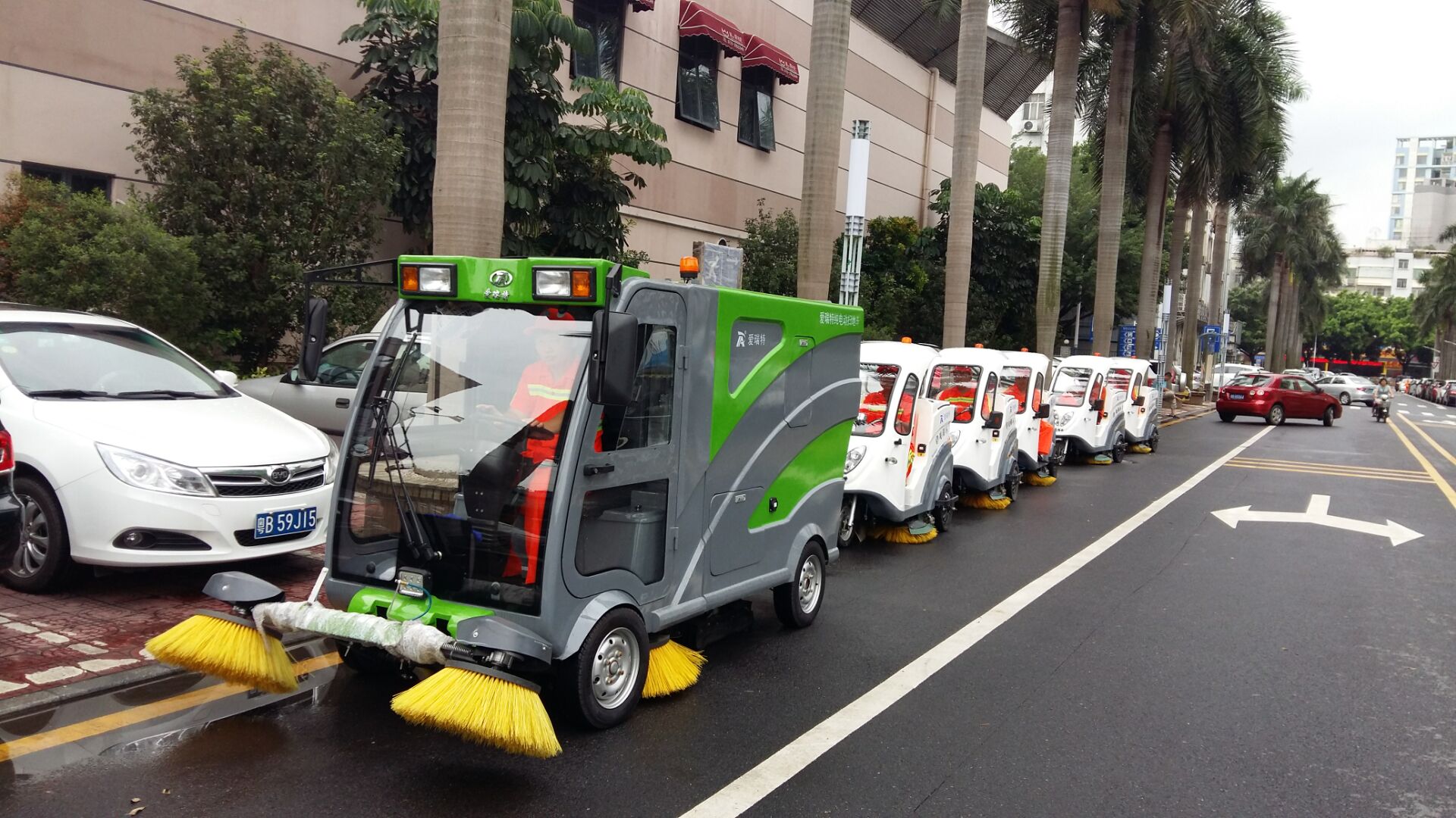 愛瑞特及龍華辦事處工作人員接到通知后,準備了一場特別的歡迎儀式。到達調研現場,迎面看到的是“愛瑞特儀仗隊”整齊劃一地停在馬路邊,等待領導的視察檢閱,成為觀湖街道上一道特別的風景線。龍華新區辦事處工作人員向相關領導系統詳細地匯報了環衛項目的進展和后續規劃,并讓環衛工作人員現場演示清掃過程。